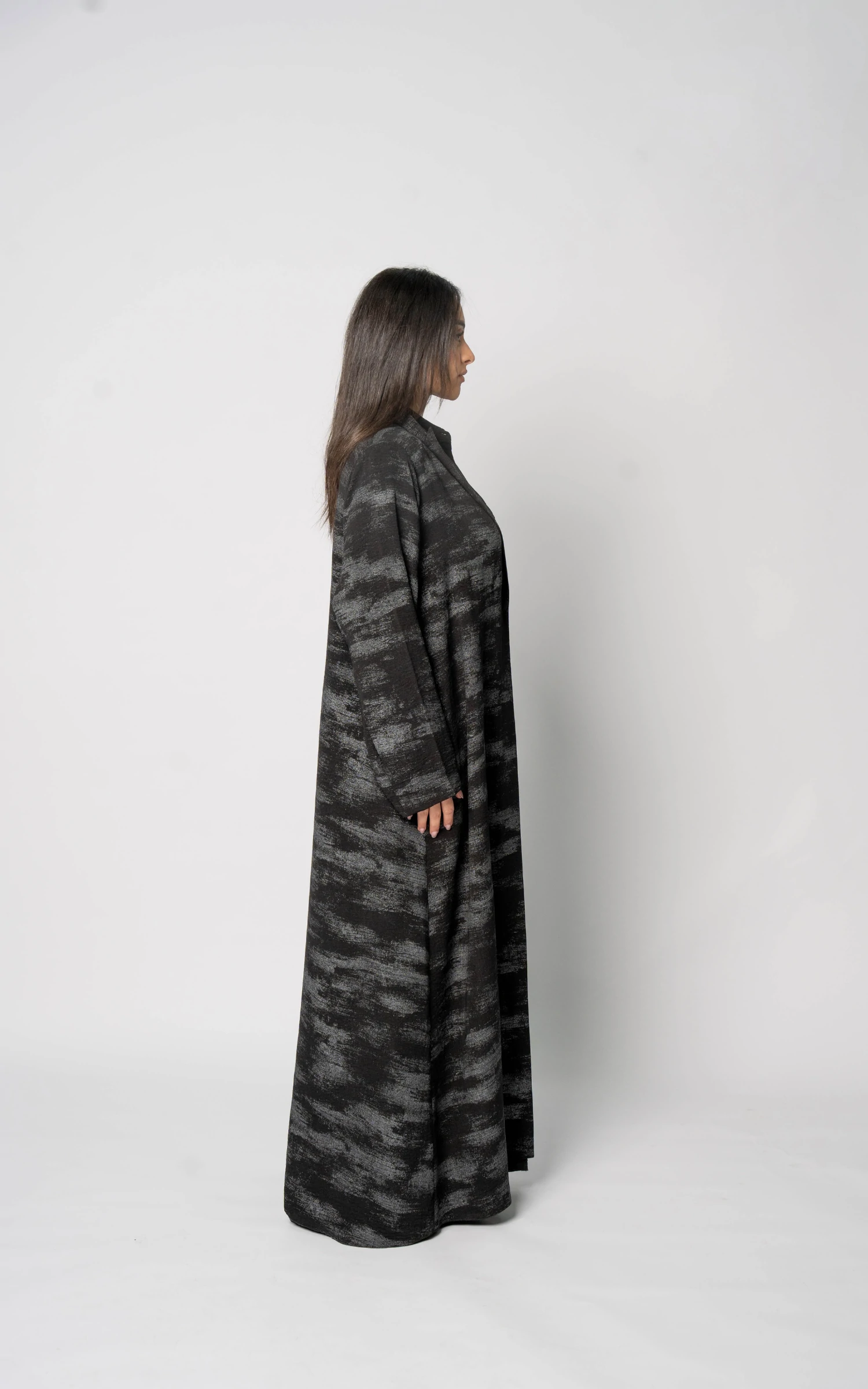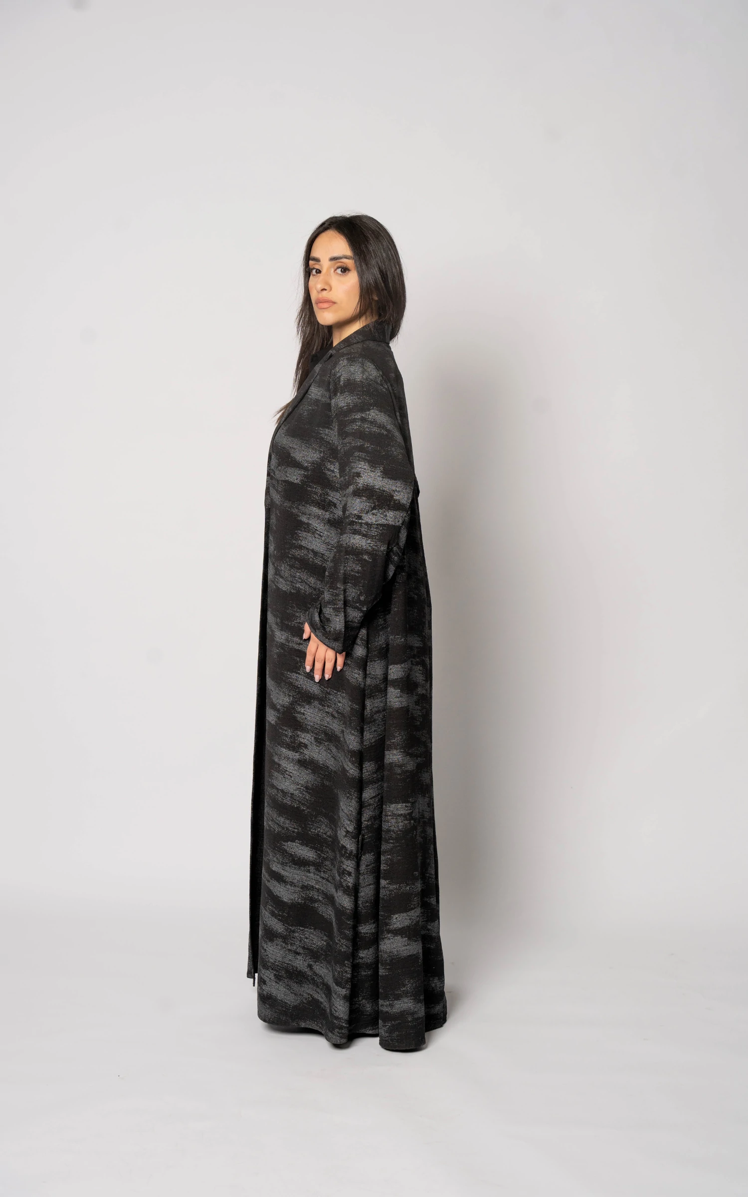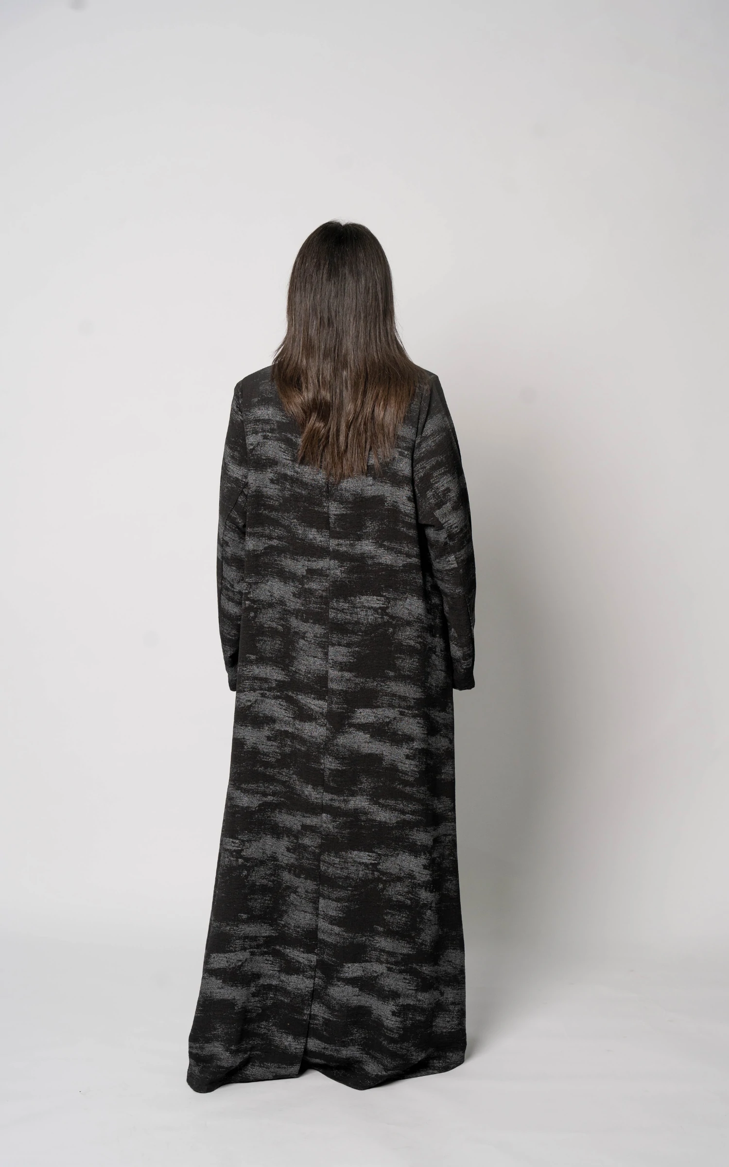 Tailored in elegant printed linen fabric, this piece is thoughtfully created for the summer season. The breathable linen offers lightness and comfort, while the refined black print adds depth and character without overwhelming the silhouette. The design balances structure and flow, allowing graceful movement with every step.