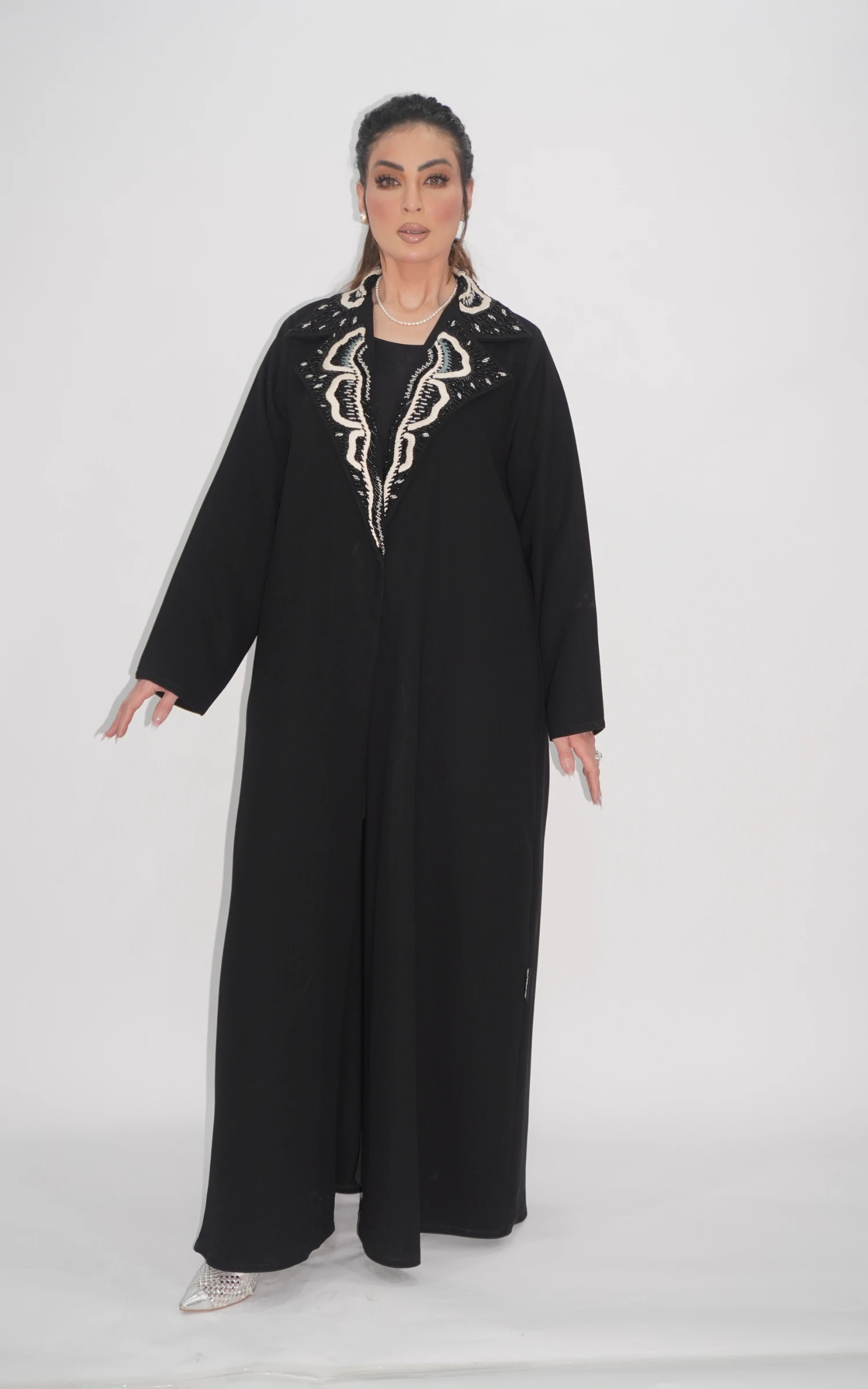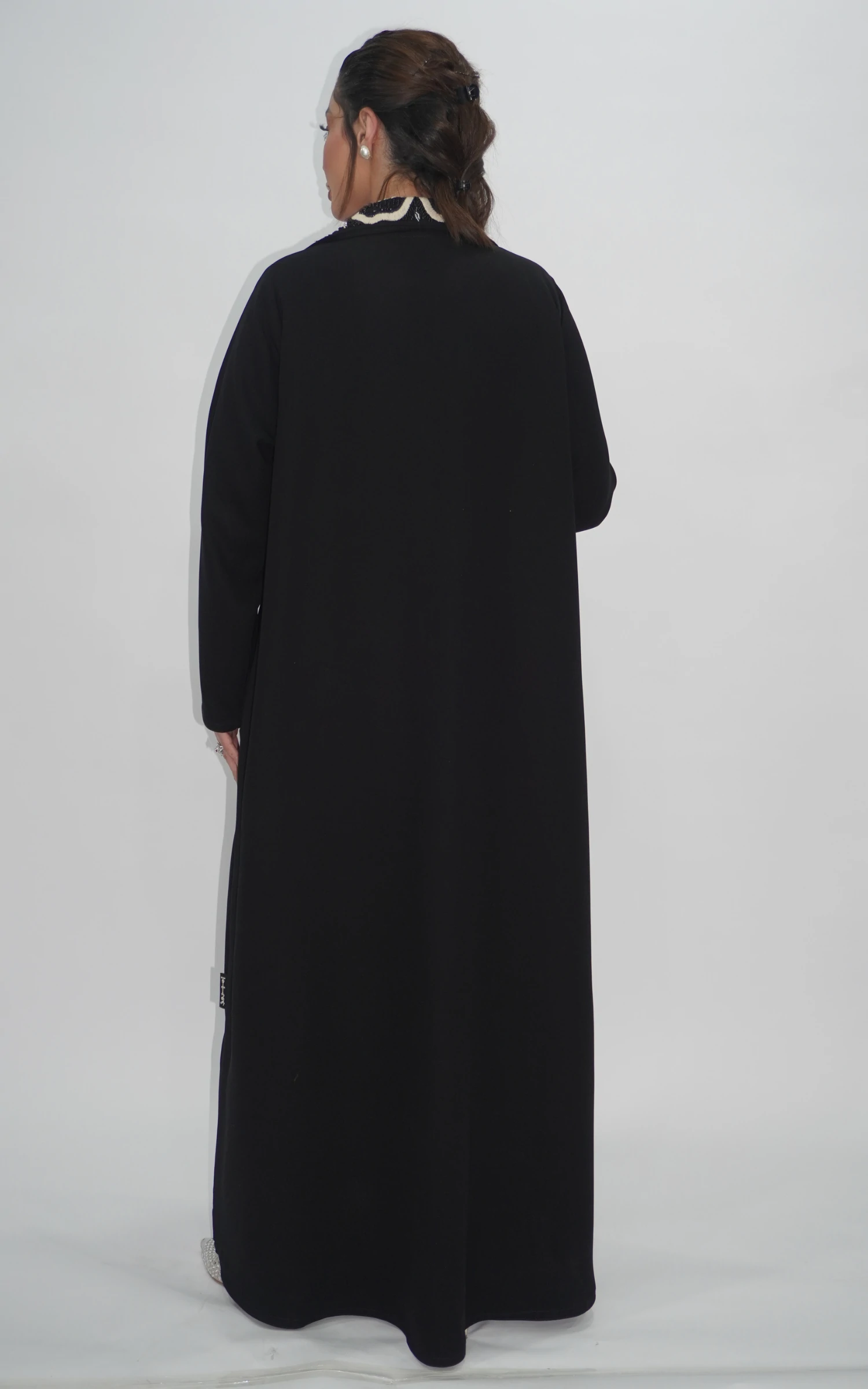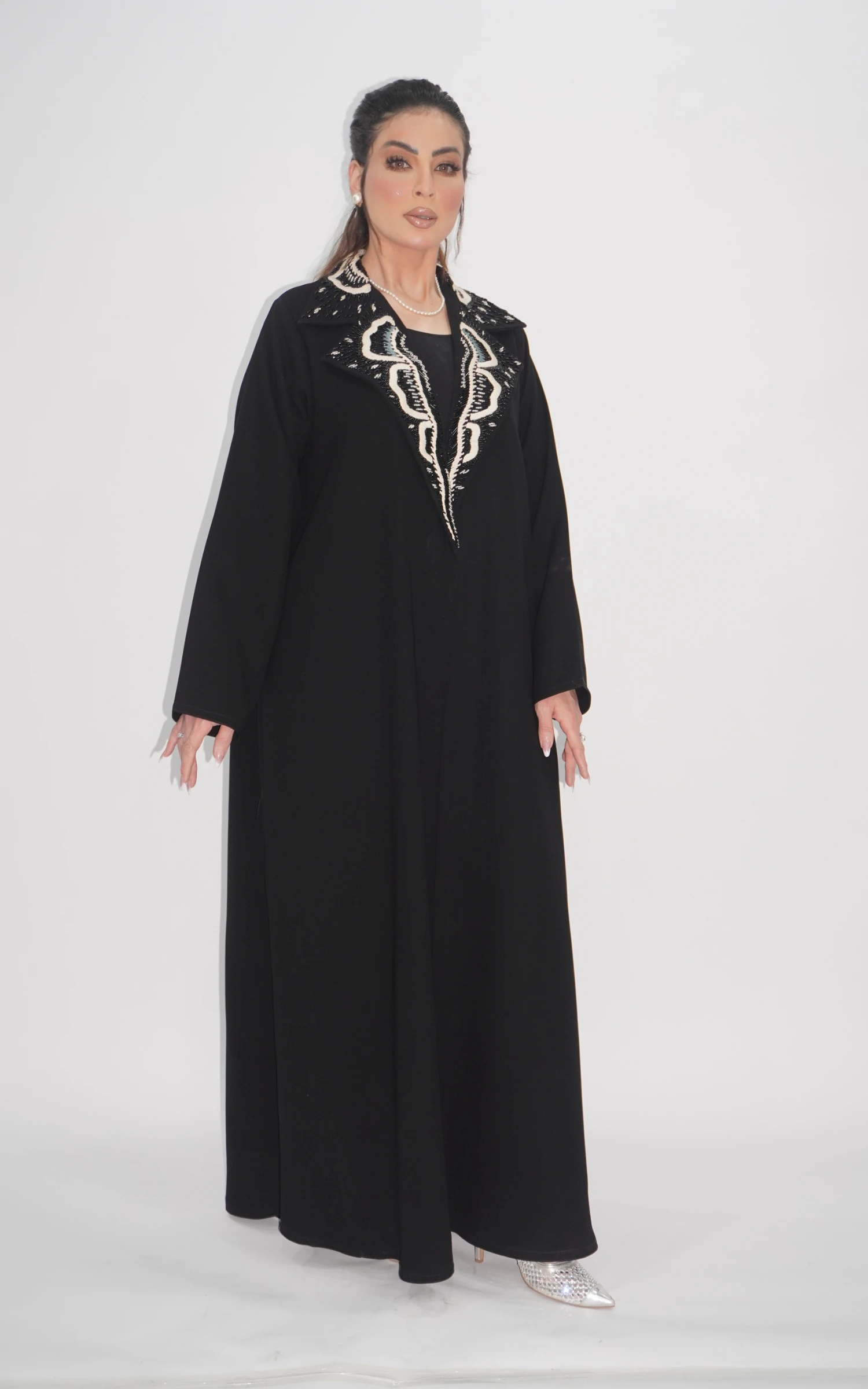 Crafted from our premium Cuba fabric, the abaya offers a structured yet fluid silhouette that drapes effortlessly. The collar is adorned with intricate thread and crystal handwork, creating a luminous frame around the neckline. The detailing extends beautifully along the front, forming a refined statement that is powerful yet balanced. Each crystal is thoughtfully placed to enhance the richness of the black fabric without overwhelming its sophistication.
